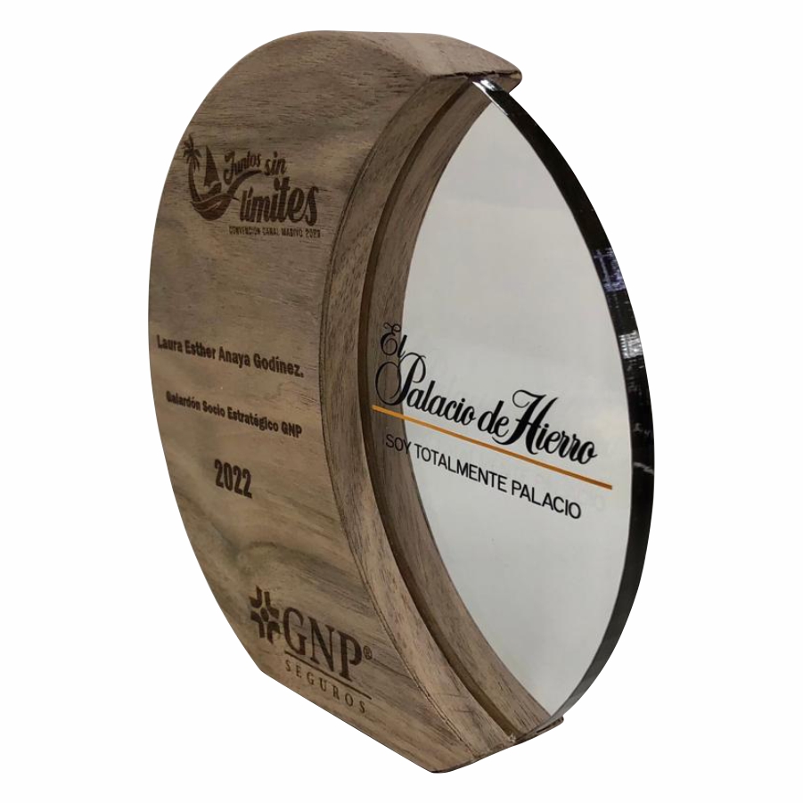 Reconocimiento de madera nogal americano con acrílico de 6 mm. Incluye grabado láser personalizado e impresión en acrílico.