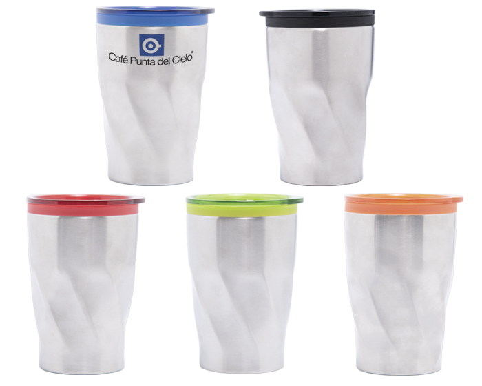 Termo de acero inoxidable con interior de plástico. Cuenta con tapa deslizable al color del interior. Diseño poligonal de rombos. CAP. 350 ml.
