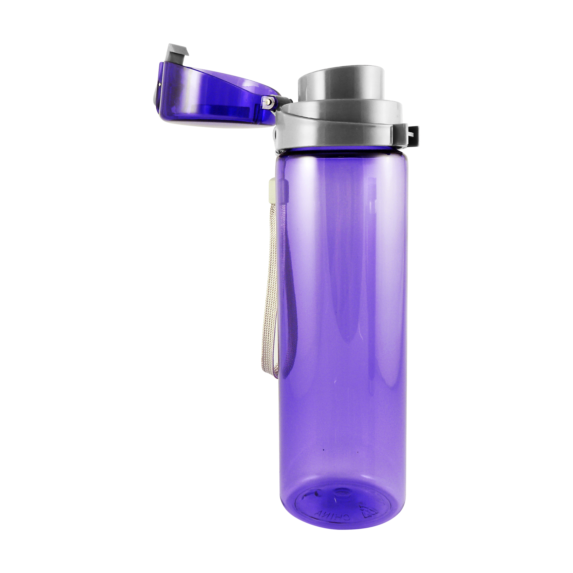 Cilindro de Tritan con tapa de polipropileno y correa de nylon, capacidad 700 ml. colores: azul, morado, verde y rojo.